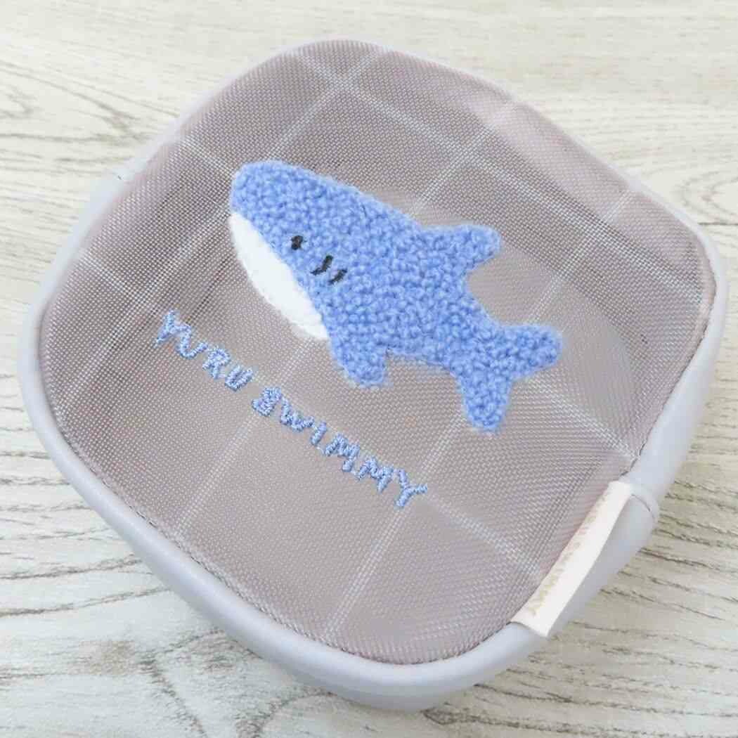 日本 Q-LiA YURU SWIMMY 鯊魚 毛毛刺繡 網布面 迷你袋 化妝袋 方形小袋 (89924)