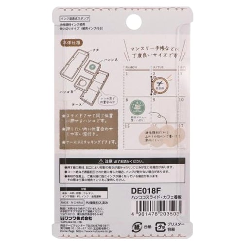 Kutsuwa 日版 Hancoco slide 可堆疊 雙色雙圖案 印章 (咖啡館招牌 DE018F) ▪️ 這是一種可以將 2 種顏色和 2 種圖案的印章堆疊在同一位置的印章。 ▪️ 全新設計,方便您滑動疊印印章。 ▪️ 對準視窗方便您輕鬆蓋印在所需位置,尺寸完美適用於每月計畫本和自由日記本。 ▪️ 每個印章可以單獨使用,或可配合其他款的印章自由創作。 ▪️ 水性墨水防暈染,易於排列,為您的計畫本增添趣味。 ▪️ 它是滲透性印章,無需墨水即可立即印章! ▪️ 附2枝補充墨水。 印章尺寸:約 H25 x W28 x D12mm 包裝尺寸:約 H130 x W80 x D16mm 材質:ABS (主體)、聚氨酯 (印章)、PE (墨水容器) 連包裝重量:約 32g 日本進口 Made in China