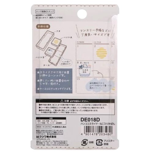Kutsuwa 日版 Hancoco slide 可堆疊 雙色雙圖案 印章 (貓咪包包 DE018D) ▪️ 這是一種可以將 2 種顏色和 2 種圖案的印章堆疊在同一位置的印章。 ▪️ 全新設計,方便您滑動疊印印章。 ▪️ 對準視窗方便您輕鬆蓋印在所需位置,尺寸完美適用於每月計畫本和自由日記本。 ▪️ 每個印章可以單獨使用,或可配合其他款的印章自由創作。 ▪️ 水性墨水防暈染,易於排列,為您的計畫本增添趣味。 ▪️ 它是滲透性印章,無需墨水即可立即印章! ▪️ 附2枝補充墨水。 印章尺寸:約 H25 x W28 x D12mm 包裝尺寸:約 H130 x W80 x D16mm 材質:ABS (主體)、聚氨酯 (印章)、PE (墨水容器) 連包裝重量:約 32g 日本進口 Made in China
