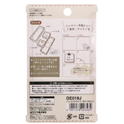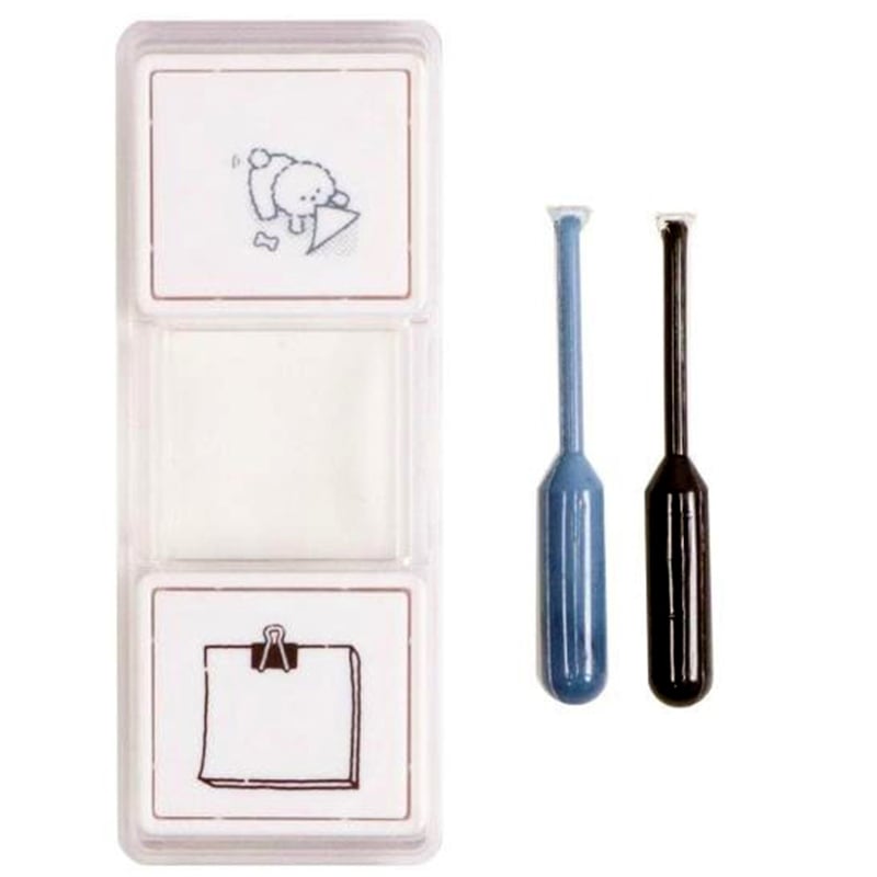 Kutsuwa 日版 Hancoco slide 可堆疊 雙色雙圖案 印章 (畫紙小狗 DE018J) ▪️ 這是一種可以將 2 種顏色和 2 種圖案的印章堆疊在同一位置的印章。 ▪️ 全新設計,方便您滑動疊印印章。 ▪️ 對準視窗方便您輕鬆蓋印在所需位置,尺寸完美適用於每月計畫本和自由日記本。 ▪️ 每個印章可以單獨使用,或可配合其他款的印章自由創作。 ▪️ 水性墨水防暈染,易於排列,為您的計畫本增添趣味。 ▪️ 它是滲透性印章,無需墨水即可立即印章! ▪️ 附2枝補充墨水。 印章尺寸:約 H25 x W28 x D12mm 包裝尺寸:約 H130 x W80 x D16mm 材質:ABS (主體)、聚氨酯 (印章)、PE (墨水容器) 連包裝重量:約 32g 日本進口 Made in China