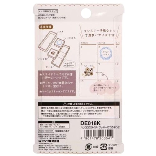 Kutsuwa 日版 Hancoco slide 可堆疊 雙色雙圖案 印章 (什錦餅乾 DE018K) ▪️ 這是一種可以將 2 種顏色和 2 種圖案的印章堆疊在同一位置的印章。 ▪️ 全新設計,方便您滑動疊印印章。 ▪️ 對準視窗方便您輕鬆蓋印在所需位置,尺寸完美適用於每月計畫本和自由日記本。 ▪️ 每個印章可以單獨使用,或可配合其他款的印章自由創作。 ▪️ 水性墨水防暈染,易於排列,為您的計畫本增添趣味。 ▪️ 它是滲透性印章,無需墨水即可立即印章! ▪️ 附2枝補充墨水。 印章尺寸:約 H25 x W28 x D12mm 包裝尺寸:約 H130 x W80 x D16mm 材質:ABS (主體)、聚氨酯 (印章)、PE (墨水容器) 連包裝重量:約 32g 日本進口 Made in China