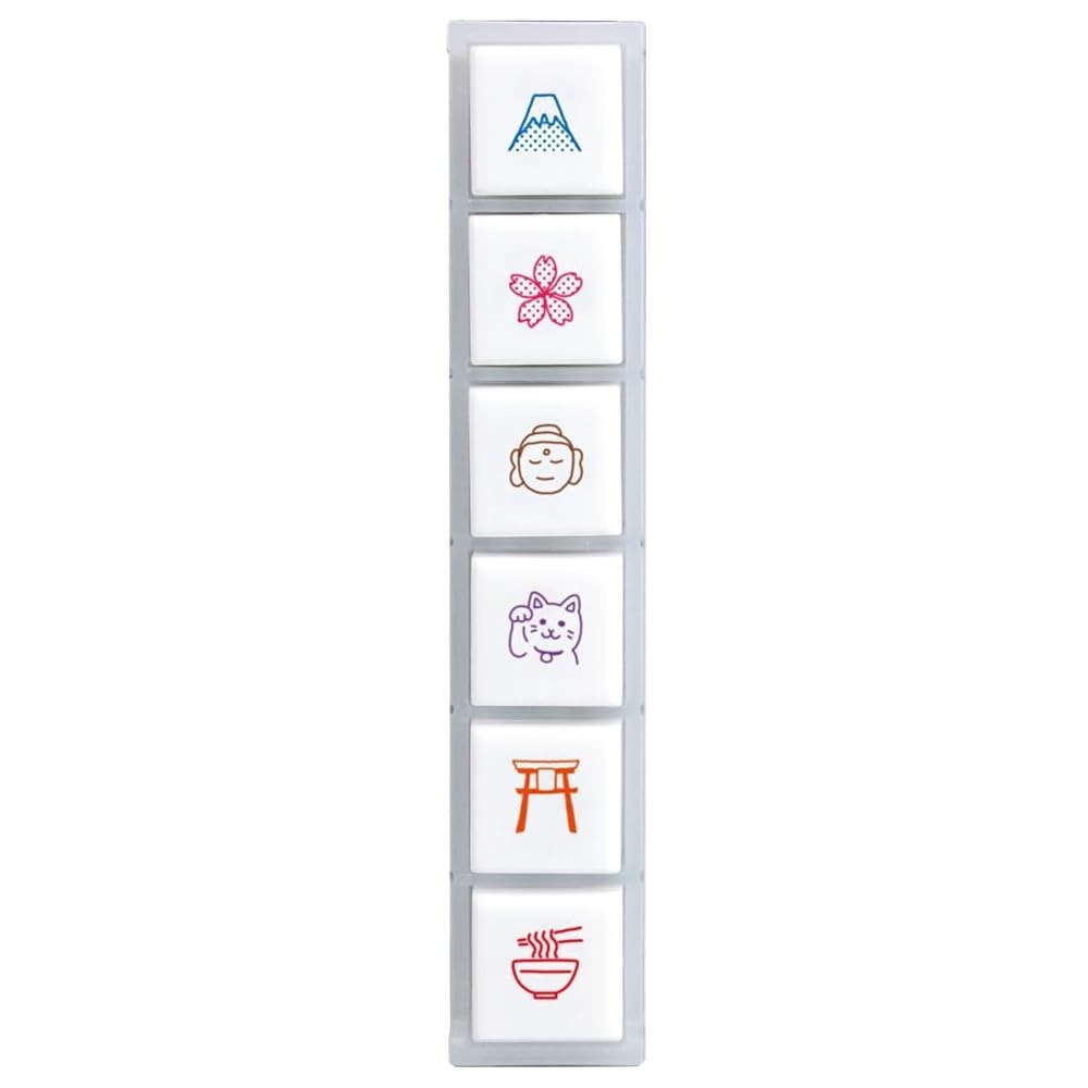 Pochitto6 日版 日式圖案 6連印章 (1850-012) ▪️ 它是滲透性印章,無需墨水即可立即印章! ▪️ 按鈕式印章 ▪️ 只需放平身印章,按壓輕鬆,不易晃動! ▪️ 即使放在鉛筆盒裡,也不佔空間! ▪️ 用於裝飾筆記本、記事本、信件等。 圖案包括:富士山、櫻花、大佛、招財貓、鳥居、拉麵 整體印章尺寸:約 W15 x D14 x H77mm 包裝尺寸:約 W62 x D18 x H120mm 墨水:油性顏料 材質:ABS、PS 連包裝重量:約 20g 日本進口 Made in China
