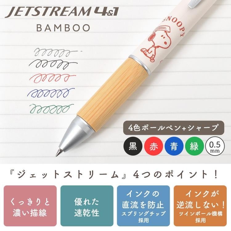Snoopy 日本製 uni Jetstream 4&1 Bamboo 多功能 5用筆 0.5mm 4色原子筆 + 0.5mm 鉛芯筆 (305721) 墨水顏色:0.5mm 黑色,紅色,藍色,綠色 鉛芯筆:0.5mm 尺寸: 149m (長) x 14mm (直徑) 材質:ABS樹脂、竹子、黃銅、鋼 連包裝重量:約 39g 日本直送,日本製造 Made in Japan