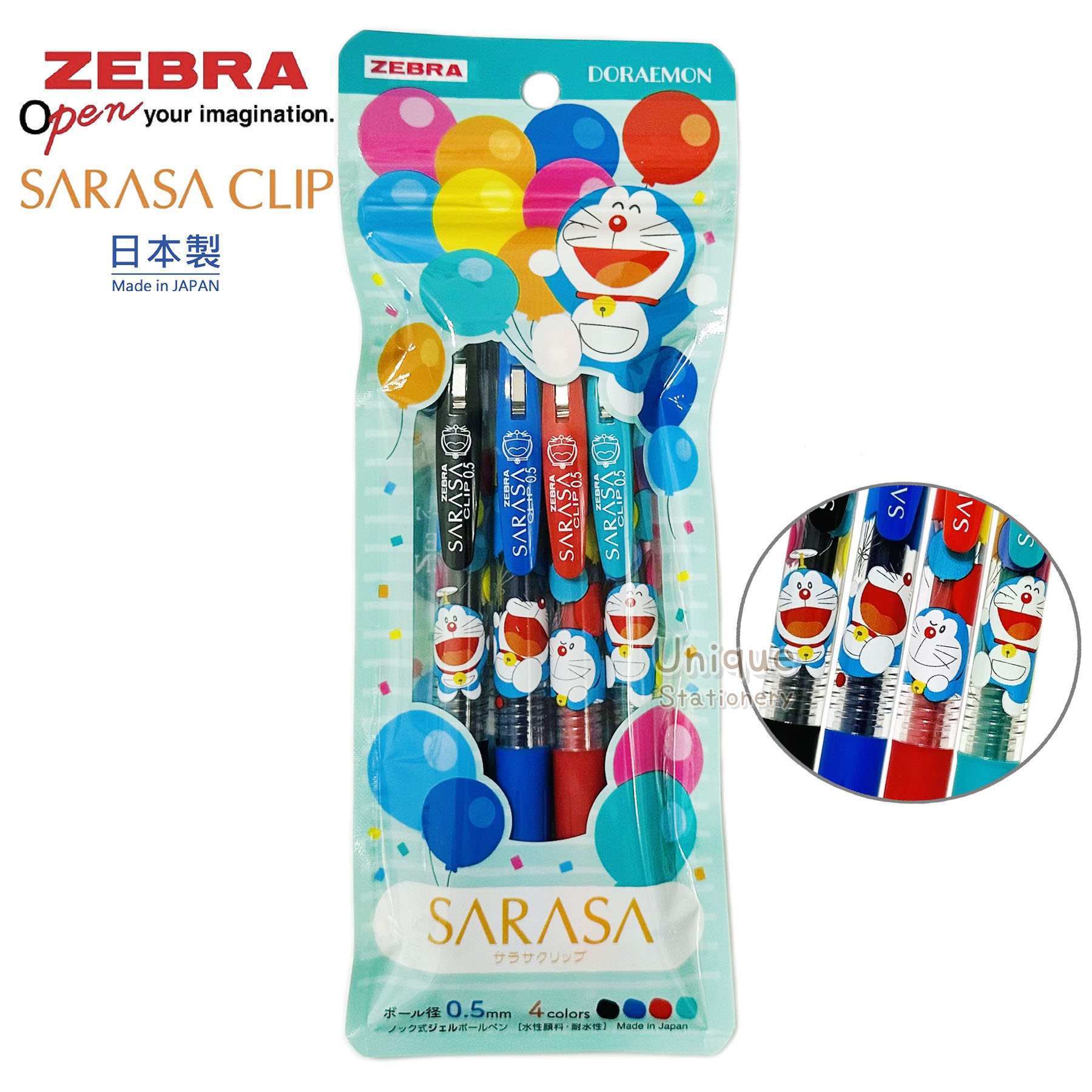 Doraemon 多啦A夢 叮噹 日本製 Zebra SARASA CLIP 0.5mm 啫喱筆 4色套裝 (860214017) 墨水顏色: - 0.5mm 黑色 Black - 0.5mm 鈷藍色 Cobalt Blue - 0.5mm 紅色 Red - 0.5mm 藍綠色 Blue Green 尺寸:141mm (長) x 11mm (直徑) 重量:約 10.9g/枝 日本直送,日本製造 Made in Japan