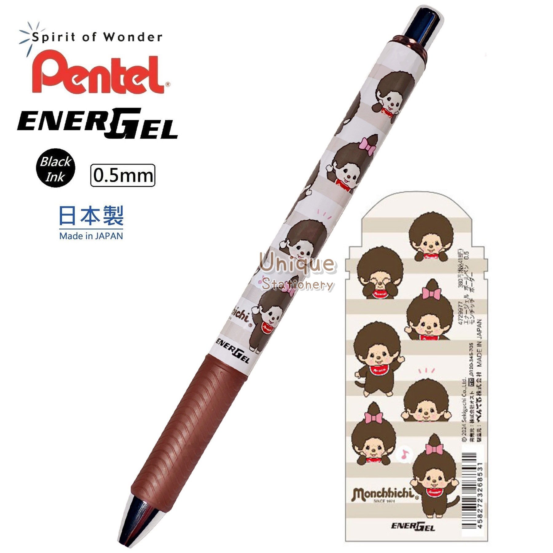 Monchhichi 日本製 Pentel EnerGel 0.5mm 黑色 啫喱筆 (4729977) 墨水顏色:0.5mm 黑色 尺寸:148mm (長) x 11mm (值徑) 材質:ABS 重量:約 12.6g 日本進口,日本製造 Made in Japan