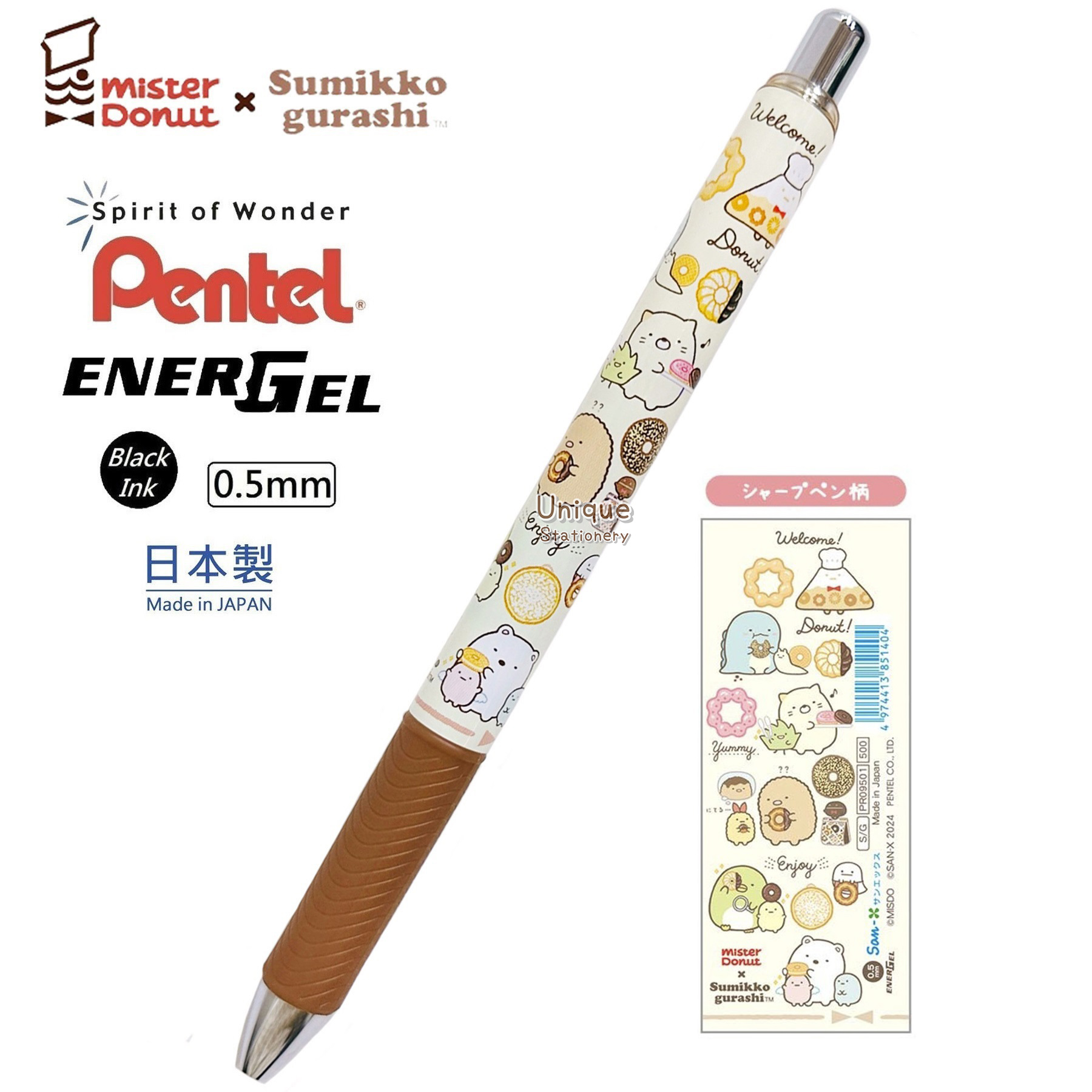 San-X 角落生物 Sumikko Gurashi x Mister Donut 日本製 Pentel EnerGel 0.5mm 黑色 啫喱筆 (PR09501 B) 墨水顏色:0.5mm 黑色 尺寸:148mm (長) x 11mm (值徑) 材質:ABS 重量:約12.6g 日本進口,日本製造 Made in Japan