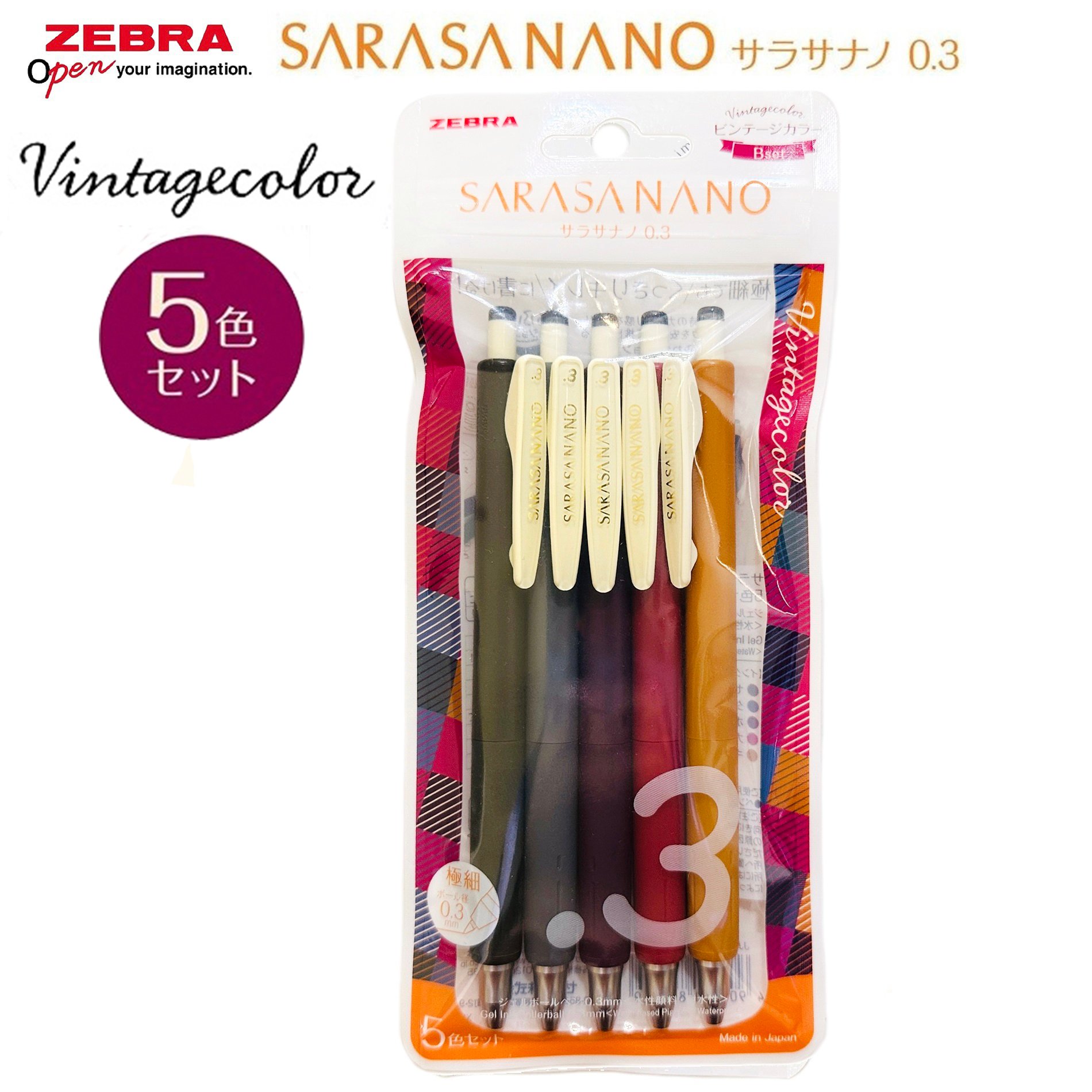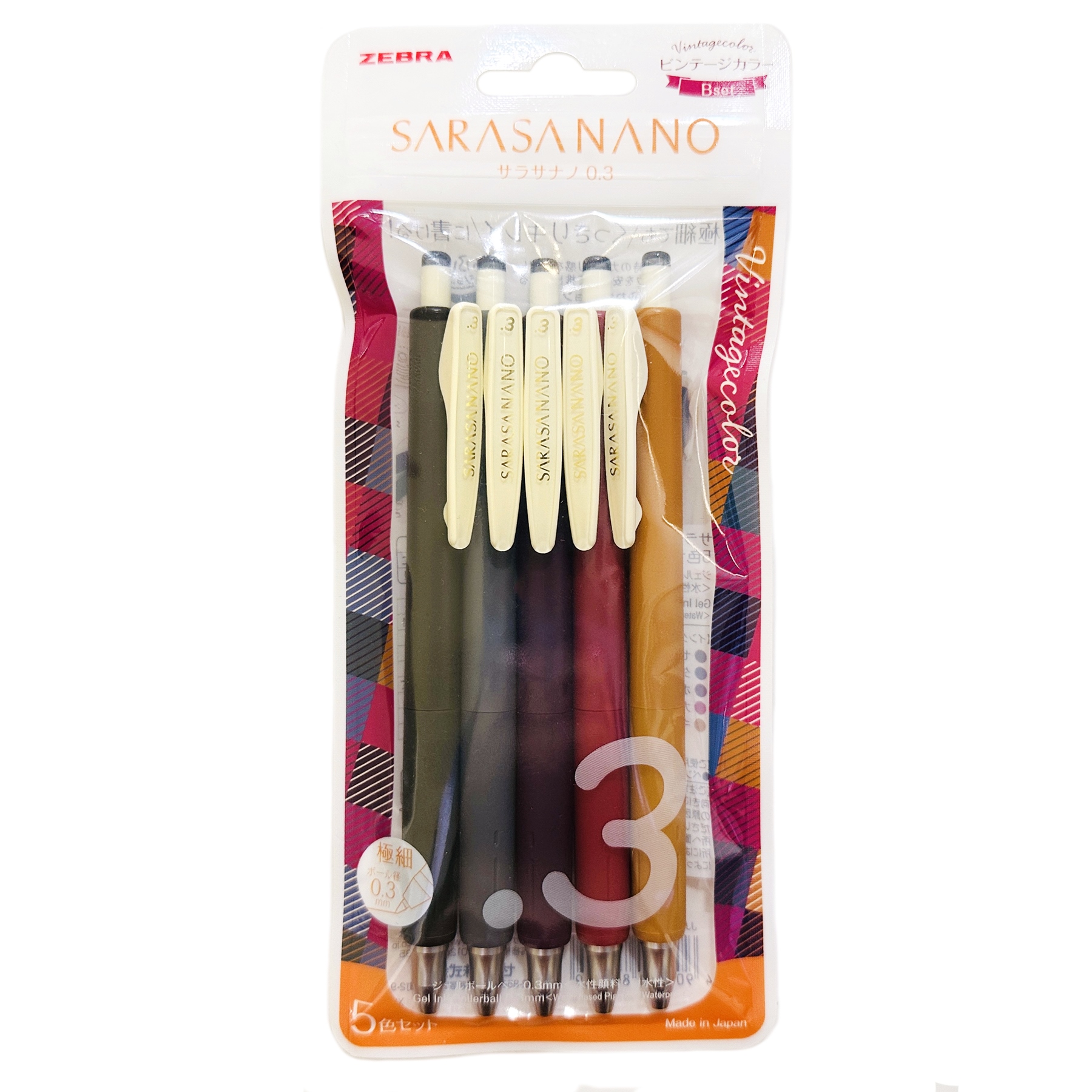 現貨|【5色套裝】限定版 日本製 Zebra SARASA NANO 0.3mm 啫喱筆 Vintage Color 復古色 (JJH72-5C-B) 墨水顏色:0.3mm 墨黑色、深灰色、波爾多紫色、黑醋栗紅色、駝黃色 筆尺寸:143.8mm (長) x 10.8mm (直徑) 重量:約 13g (每枝) 套裝重量:約 68g 日本直送,日本製造 Made in Japan