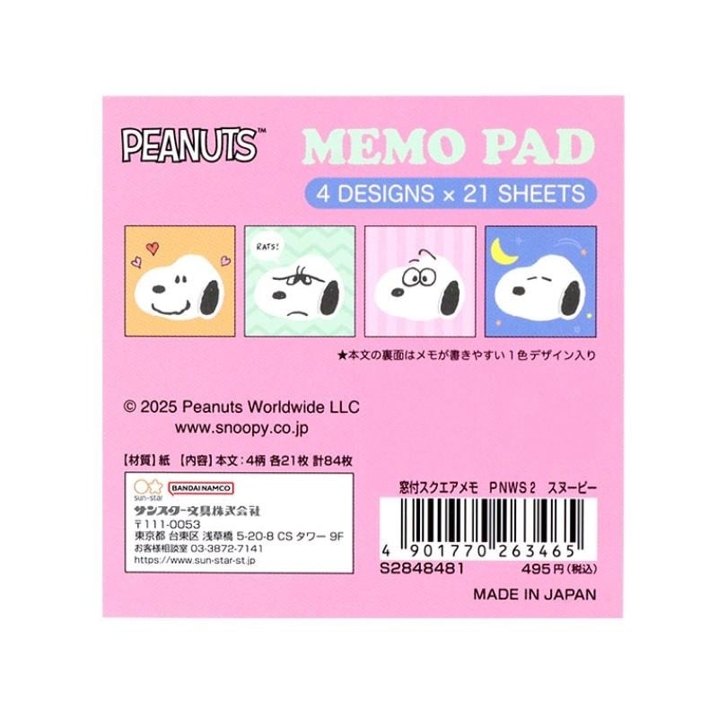 Snoopy 日本製 便條紙 Memo Notepad (S2848481) 尺寸:約 W82mm x H82mm x D8mm 便條紙數量:約84張 (4 款圖案,每款 21張) 材質:紙 重量:約 53g 日本進口,日本製造 Made in Japan