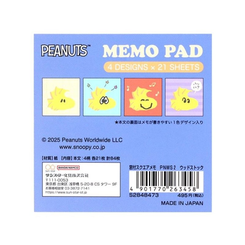 Woodstock Snoopy 日本製 便條紙 Memo Notepad (S2848473) 尺寸:約 W82mm x H82mm x D8mm 便條紙數量:約84張 (4 款圖案,每款 21張) 材質:紙 重量:約 53g 日本進口,日本製造 Made in Japan